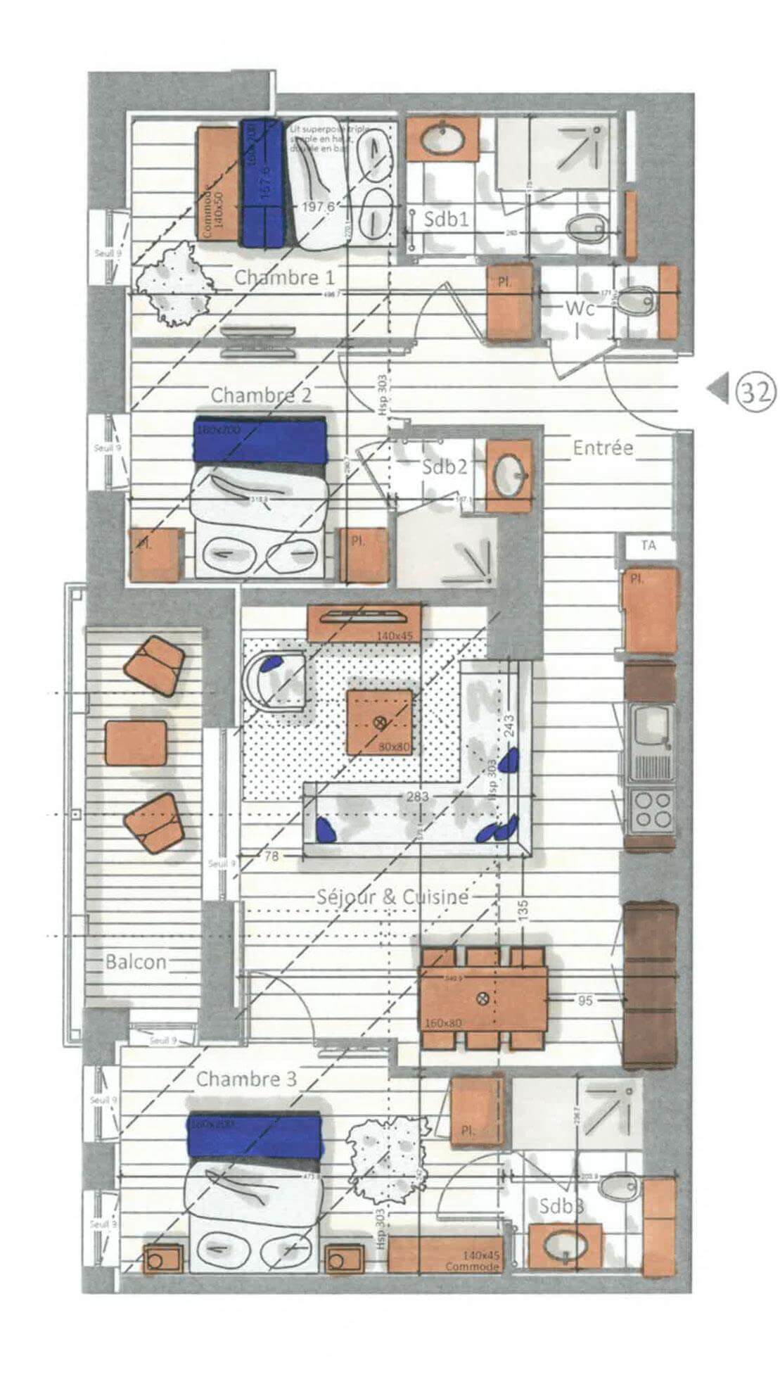 Penthouse apartment no. 32, located on the top floor of the Kinabalu resort, offers a superb 85 m², sleeping up to 7 people.